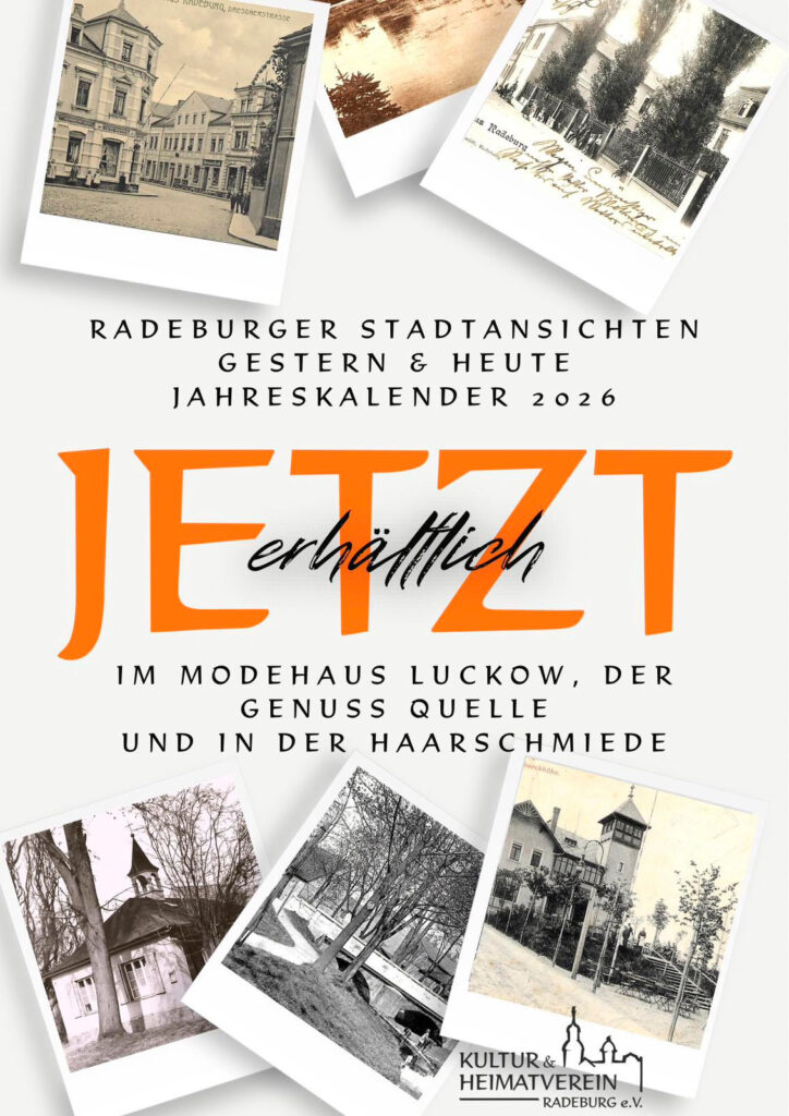 Der Kultur- und Heimatverein Radeburg e.V. hat wieder Kalender für das kommende Jahr 2026: Stadtansichten – gestern & heute.Neben dem klassichen Wandkalender zum Aufhängen gibt es dieses Mal auch neu die Aufstellvariante mit passendem Fuß.Die Kalender sind mit viele Liebe zum Detail gestaltet und bieten eine kleine Zeitreise durch Radeburg.Erhältlich sind die beiden Kalendervarianten im […]